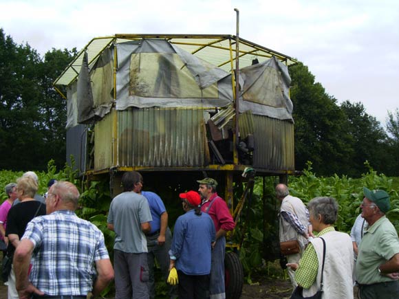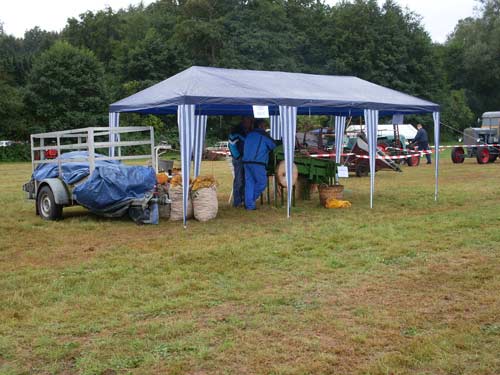 Wir wurden freundlich begrüßt und begaben uns dann ins Fahrerlager, wo wir unsere Wohnwagen dann aufstellten. Am Samstag füllte sich dann das Gelände immer mehr und es waren so um die 100 Schlepper aller Art da. Es fanden Vohrführungen statt, wie z.B. Dreschen, Torfpressen, Buschhacken, Heuernte, Kartoffelroden, Tabakpflücken, Holzschreddern und vieles mehr. Man konnte den Frauen beim Blumenstraußbinden zuschauen und selbst durfte man wie zu Großvaters Zeiten Kartoffeln sammeln (hinter der Schleuder). Ein Hingucker waren auch die Rischer Ausstellung. Auf einer anderen Koppel sah man wie das Dreschen damals war und wie heute. Auf einer Wiese sah man wie Heu gemacht wurde. Ein kleiner Floh- und Teilemarkt lud zum Stöbern ein und fürs leibliche wohl war auch gesorgt.